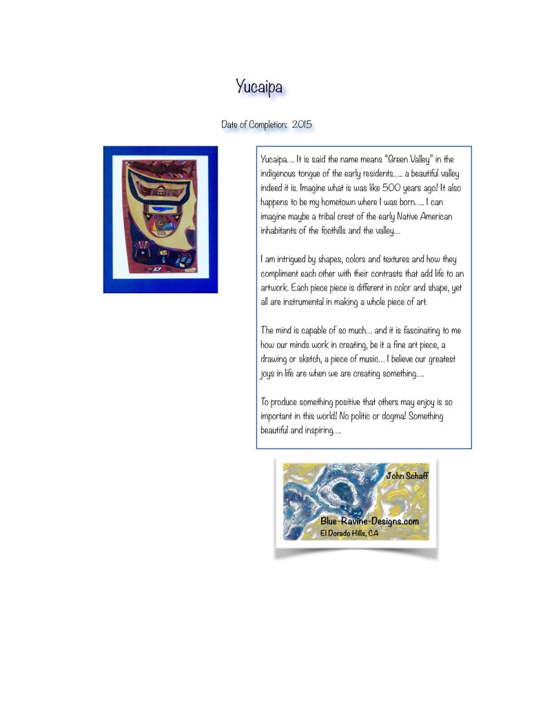 This is a piece named after my hometown where I grew up. The artwork has a Native-American influence as my hometown was inhabited by the Serrano tribe. Yucaipa is a word in the Serrano language that means “Green Valley”.